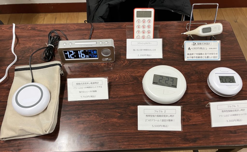 手話や手話通訳の為の本の販売や日常の生活で必要な音(チャイムや電話、電化製品のお知らせ音など)を光やバイブレーションで教えてくれる機械の紹介、都が運営するろう重複者(聞こえない➕身体、視力問題など)を対象に健康で自立した生活を支援する障害者施設たましろの郷の手作り作品などもありました。