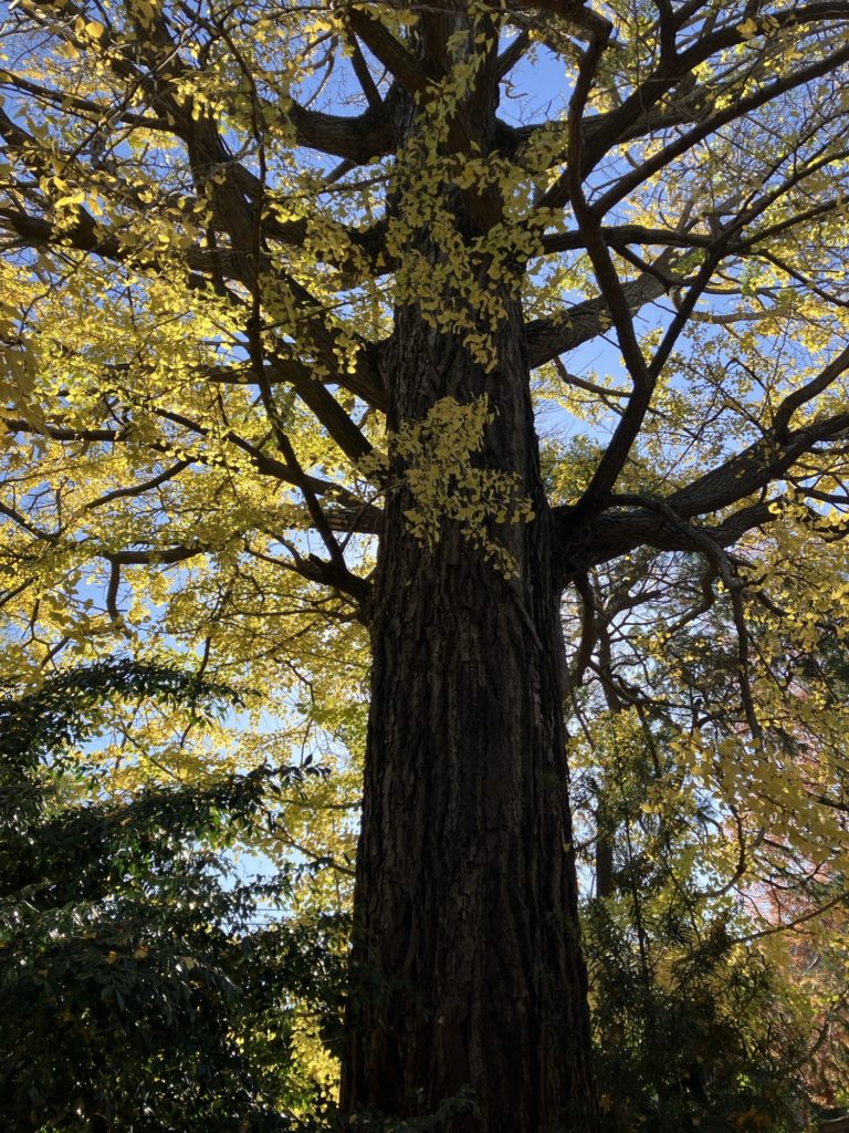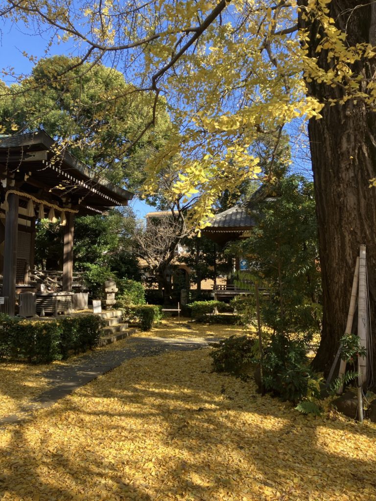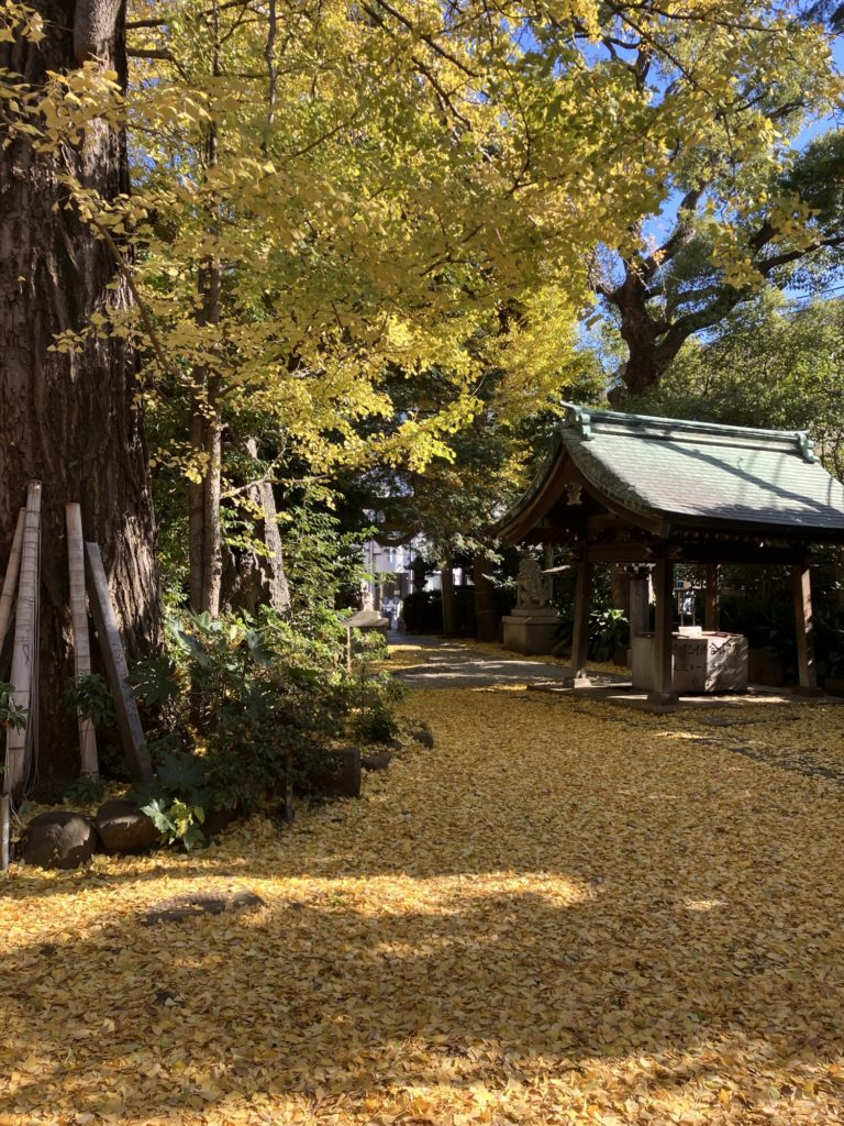 近くの奥沢神社はイチョウの葉で黄色い絨毯が敷かれたようになっていました。